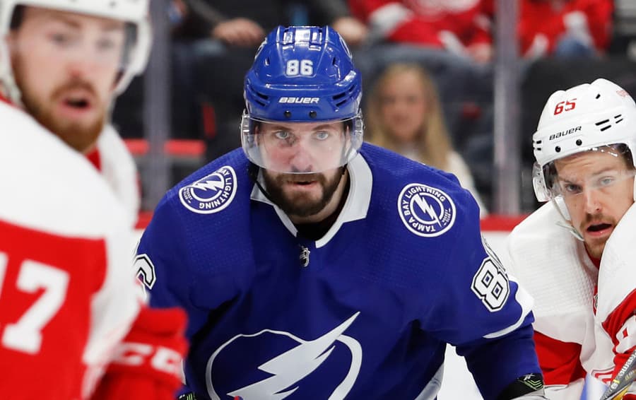 Mar 14, 2019; Detroit, MI, USA; Tampa Bay Lightning right wing Nikita Kucherov (86) watches the puck as he is defended by Detroit Red Wings defenseman Danny DeKeyser (65) during the third period at Little Caesars Arena. Mandatory Credit: Raj Mehta-USA TODAY Sports – 12347833