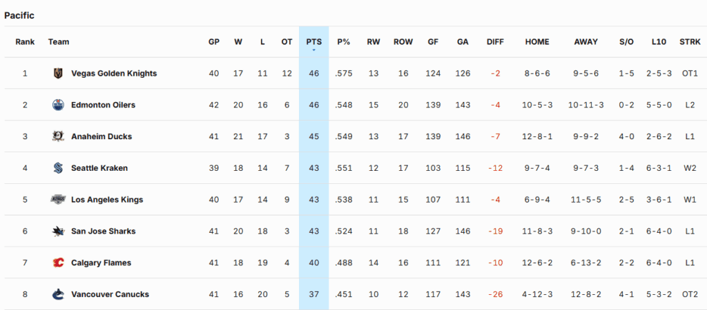 Edmonton is lucky to be tied with Vegas for first place, although the Golden Knights have two games in hand, while Anaheim is one point behind Edmonton with a game in hand. The Oilers, despite their subpar play, are still in a great position to win the division. It’s wild.