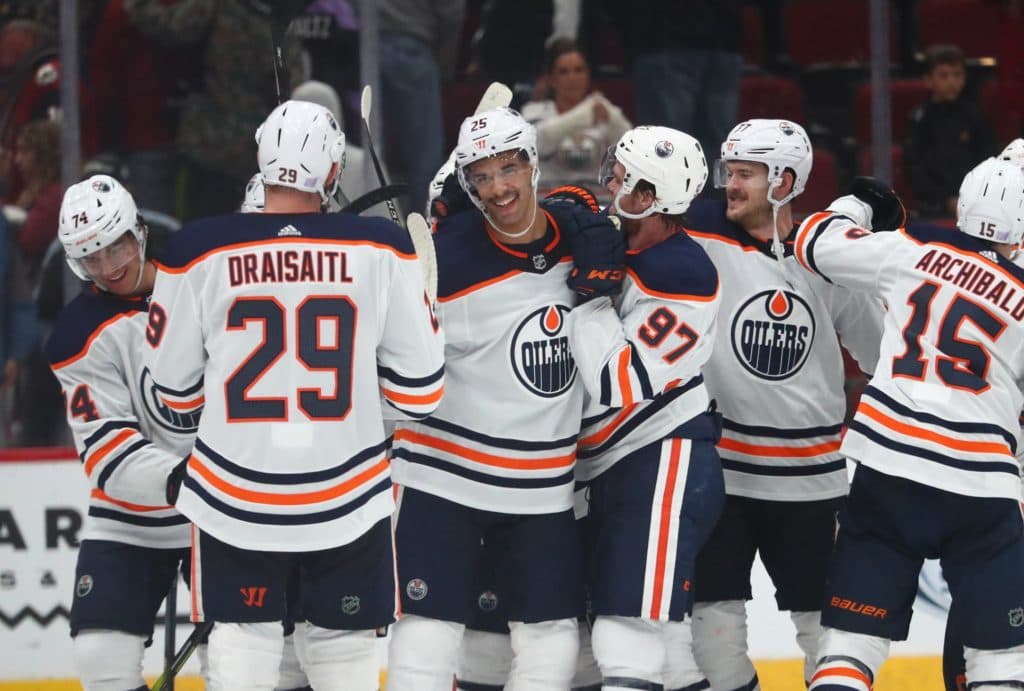 Nov 24, 2019; Glendale, AZ, USA; Edmonton Oilers defenseman Darnell Nurse (center) celebrates with teammates Connor McDavid (97) and Leon Draisaitl (29) after defeating the Arizona Coyotes in overtime at Gila River Arena.