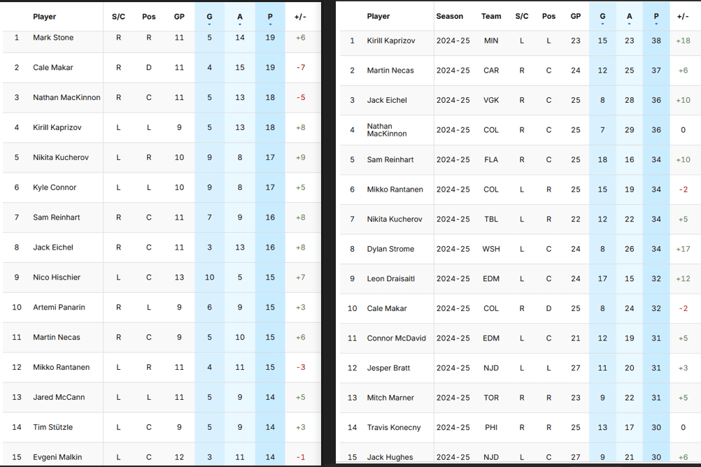 McDavid had 10 points in 10 games in October and was tied for 54th in scoring, but his 21 points in November moved him up to 11th, but he only gained one point on league leader, Kirill Kaprizov, while Martin Necas actually outscored McDavid with 22 points in November and now sits second. Necas did play four more games than McDavid, while Kaprizov played three more as McDavid missed two games due to injury.