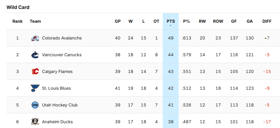 The race in the West doesn’t have as many teams, but it also looks like five teams will be battling for the final Wild Card spot. Colorado, not surprisingly, has started to win more regularly and has created a five-point lead over Vancouver for the first Wild Card spot. The Avs are also tied with Dallas for third in the Central, but Dallas has two games in hand.