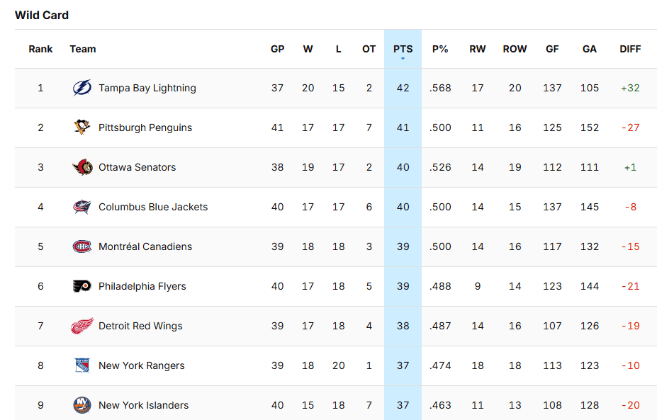 Tampa Bay and Ottawa have the best P% and they have between 1-4 games in hand on the other seven teams, but Ottawa will be without Linus Ullmark for weeks, according to Senators head coach Travis Green, and Tampa Bay has lost four in a row to San Jose, Anaheim, Montreal and LA — three of the worst teams, standing-wise, in the NHL. I still like Tampa to make the playoffs, but they’ve allowed Montreal and Detroit to gain eight points on them since December 29th.