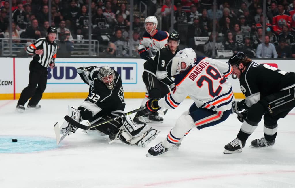 May 6, 2022; Los Angeles, California, USA; Edmonton Oilers center Leon Draisaitl (29) shoots the puck past LA Kings goaltender Jonathan Quick (32) for a goal in the first period of game three of the first round of the 2022 Stanley Cup Playoffs at Crypto.com Arena. Mandatory Credit: Kirby Lee-USA TODAY Sports