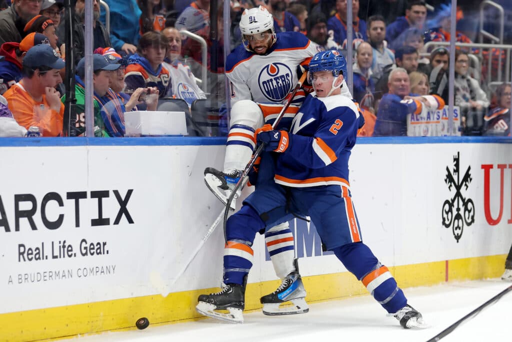 Dec 19, 2023; Elmont, New York, USA; New York Islanders defenseman Mike Reilly (2) fights for the puck against Edmonton Oilers left wing Evander Kane (91) during the third period at UBS Arena.