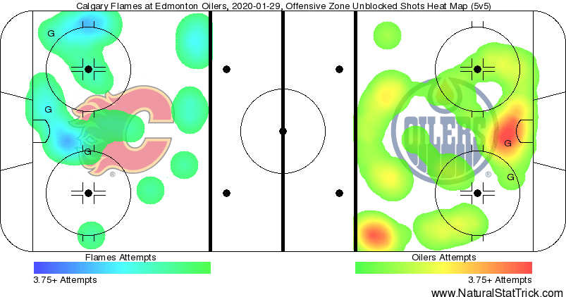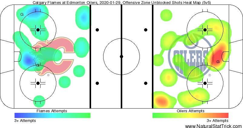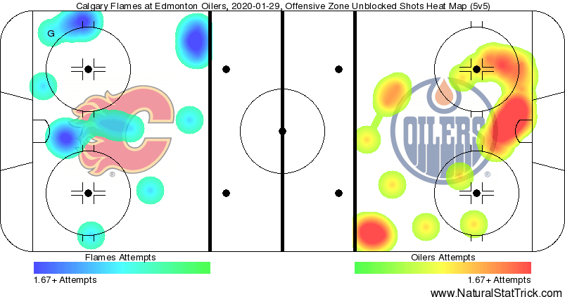 The heat chart shows that the Oilers were putting pressure on the Flames goaltender in the High Danger zone in front of the net.; @David Rittich simply had a phenomenal period, and was the reason the Flames held the lead going into the intermission (that, and an unfortunate bounce off of @Adam Larsson’s skate).