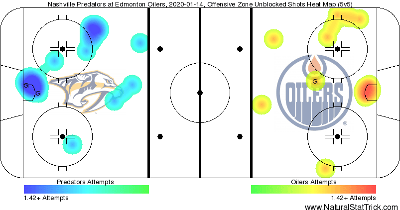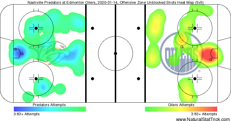 - The Oilers lost the 5v5 Corsi battle (barely), though had more Scoring Chances and High Danger opportunities. But it was the special teams that ultimately gave the Oilers the edge; they killed off both Predators powerplays, allowing only 1 High Danger chance in 4:23 of PK time, and converted on 50% of their man-advantages (albeit one was an empty-netter, but they all count in the end.)