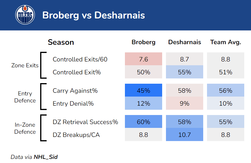 This season, I began a manual tracking project for Oilers games, tracking statistics known as microstats. Here’s a look at some of Desharnais and Broberg’s microstats for this season, compared to the team average: