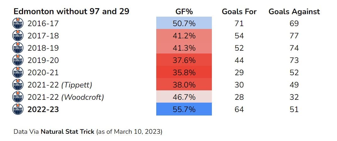 The Oilers have out-scored the opposition at a ratio of 64 to 51 with McDavid and Draisaitl off-ice at 5v5, equating to a 56 percent goal differential, by far the best it’s ever been in the McDavid and Draisaitl era. That goal differential is actually higher than the differentials of most cup-winning teams without their top-two players in the past couple of years.