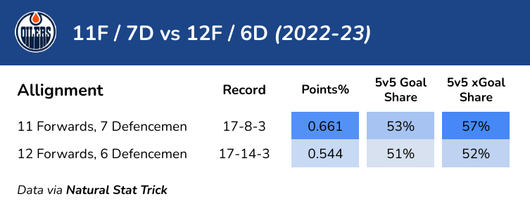 The team has a markedly better points percentage, goal differential, and expected goal differential when running an 11F/7D alignment.