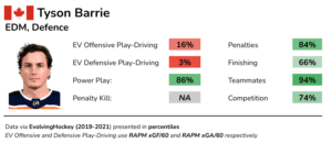 One of Edmonton’s defencemen I want to focus on is Tyson Barrie, who ranks near the bottom of the team in GA/60 and xGA/60. With a player like Evan Bouchard on the roster, what should the Oilers do with Barrie as the trade deadline comes closer?