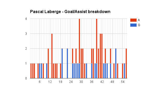 Looking at the goal and assist breakdown, we can clearly see that Laberge saw some outbursts in assists throughout the season including a four-game span where he posted 11 assists.