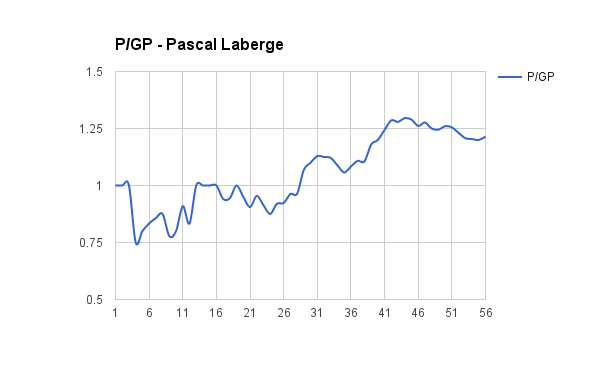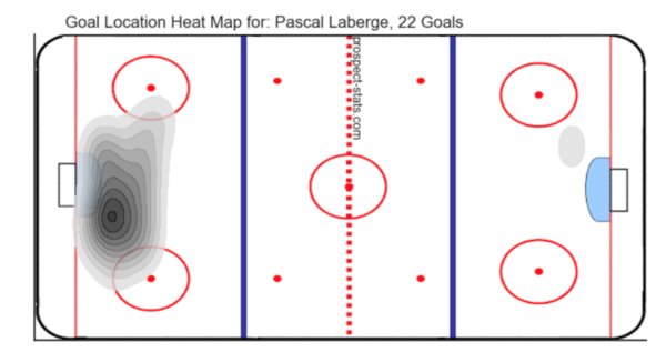 The notion that he likes to defer to his wingers is likely overstated, as the 3.3 shots/PG isn’t far behind his counterparts. It’s simply that when he did pass, it was putting his teammates in a prime position to score, thus more noticeable. Quite simply, saying Laberge is a playmaker isn’t fair, because based on his shot and goal totals, he isn’t avoiding taking shots to pass off. If he can work on his shot, he may see an improvement in his shooting percentage that will lead to further points.