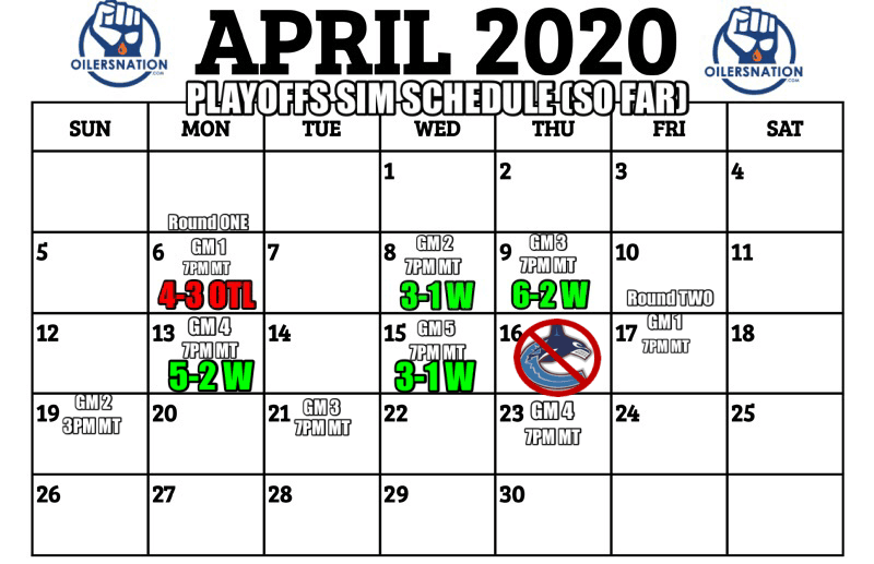 As I am sure you are aware of now, the Edmonton Oilers beat the Vancouver Canucks on home ice last night by a score of 3-1 to win the best-of-seven series 4-1. The playoffs continue to roll on around them as they join only the Islanders and Stars as the teams that have moved on. This article is to update you on what is happening in all the other series, and as an added bonus, pending the outcome of the Golden Knights/Flames series, we will have the schedule for the Oilers Round Two sim for you (at the bottom of the article)