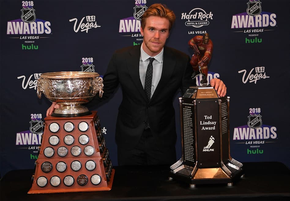 Jun 20, 2018; Las Vegas, NV, USA; Connor McDavid poses with the Art Ross and Ted Lindsay awards during the 2018 NHL Awards at Hard Rock Hotel and Casino. Mandatory Credit: Stephen R. Sylvanie-USA TODAY Sports