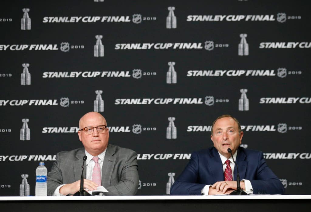 May 27, 2019; Boston, MA, USA; NHL commissioner Gary Bettman (right) and deputy commissioner Bill Daly (left) at a press conference before game one of the 2019 Stanley Cup Final between the Boston Bruins and the St. Louis Blues at TD Garden. Mandatory Credit: Winslow Townson-USA TODAY Sports