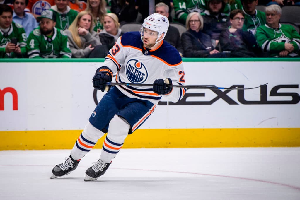 Dec 16, 2019; Dallas, TX, USA; Edmonton Oilers center Riley Sheahan (23) in action during the game between the Oilers and the Stars at the American Airlines Center. Mandatory Credit: Jerome Miron-USA TODAY Sports