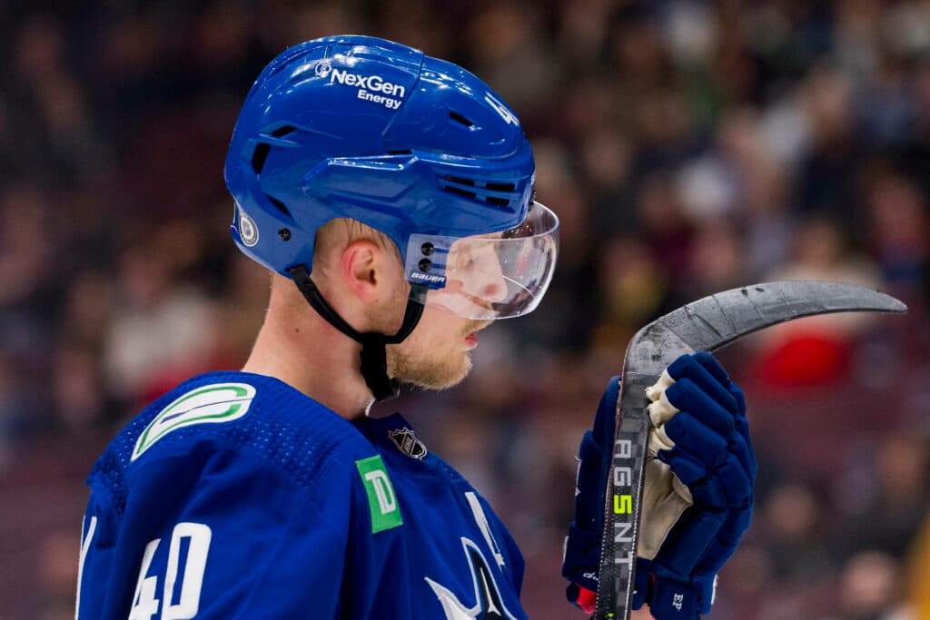 Mar 6, 2023; Vancouver, British Columbia, CAN; Vancouver Canucks forward Elias Pettersson (40) checks his stick during a stop in play against the Nashville Predators in the first period at Rogers Arena. Mandatory Credit: Bob Frid-USA TODAY Sports