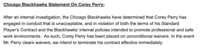 BREAKING: #Blackhawks have placed Corey Perry on unconditional waivers and plan to terminate his contract, effective immediately. Team statement: