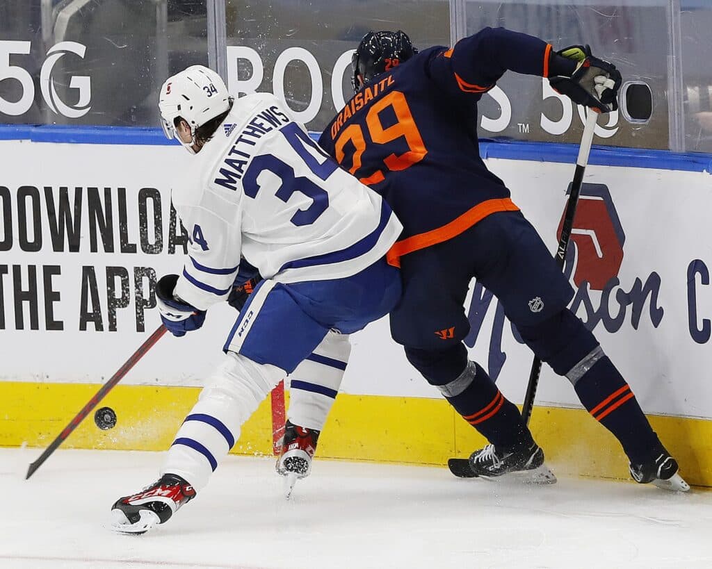 Jan 28, 2021; Edmonton, Alberta, CAN; Toronto Maple Leafs forward Auston Matthews (34) and Edmonton Oilers forward Leon Draisaitl (29) battle along the boards for a loose puck during the second period at Rogers Place. Mandatory Credit: Perry Nelson-USA TODAY Sports