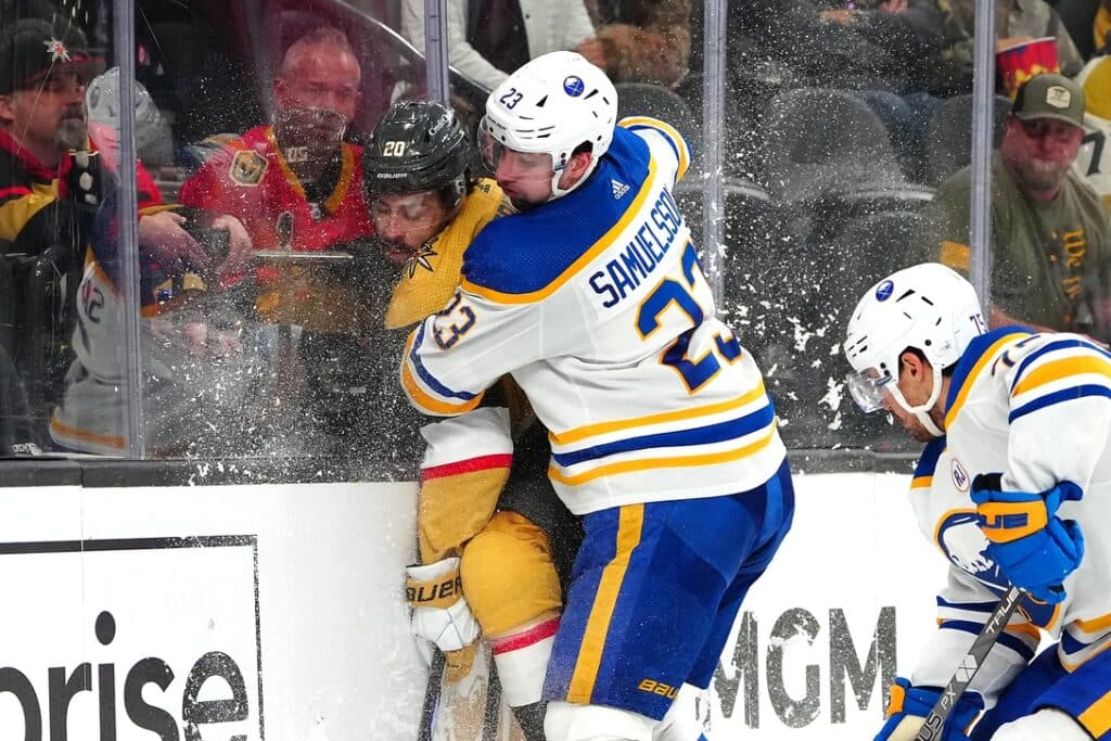 Dec 15, 2023; Las Vegas, Nevada, USA; Buffalo Sabres defenseman Mattias Samuelsson (23) checks Vegas Golden Knights center Chandler Stephenson (20) during the second period at T-Mobile Arena. Mandatory Credit: Stephen R. Sylvanie-USA TODAY Sports