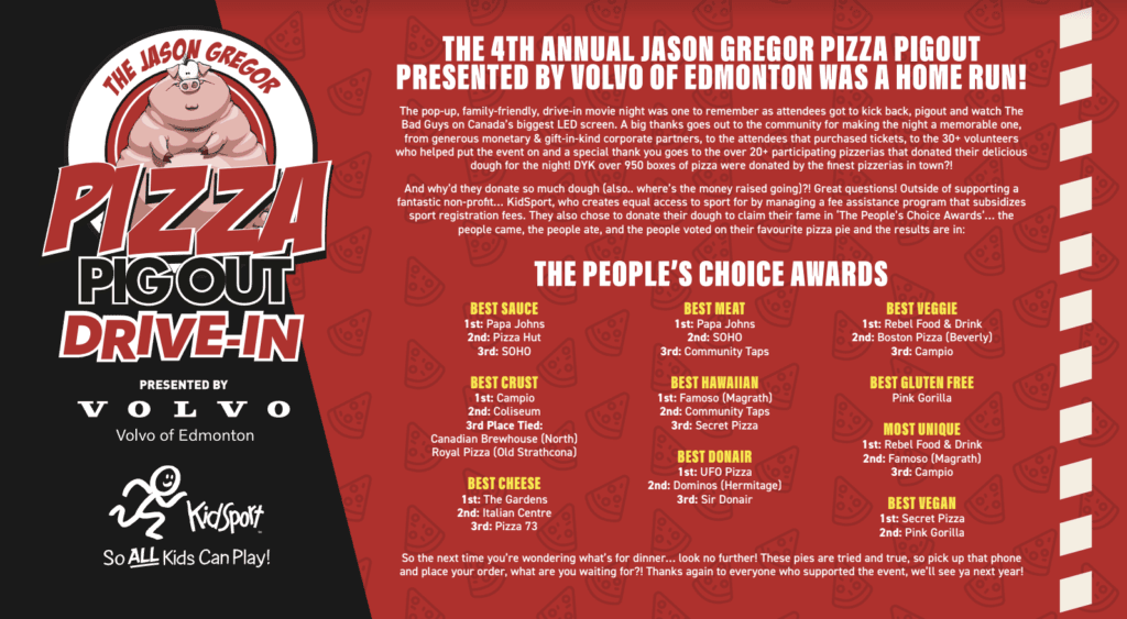 Thanks again for supporting the Pizza Pigout, and more importantly, for supporting KidSport so all kids can play. And thank you to Dayna and her team at KidSport for organizing such a great event, and a MASSIVE shout out to Renee and her incredible team of volunteers who made the evening run smoothly.