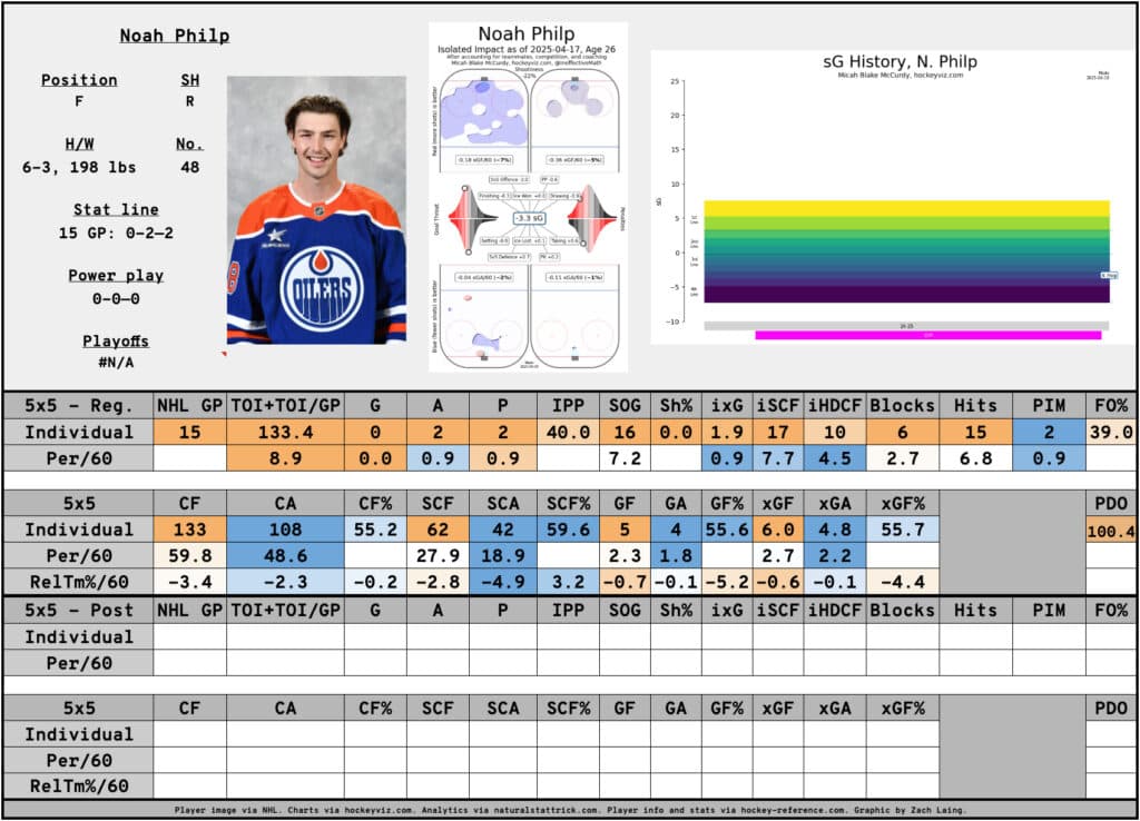 But Philp also got his first taste of the National Hockey League, appearing in 15 games for the Oilers and looking like he belonged. While he scored just two assists — one of which was in his first NHL game — he also showed an ability to be a strong play driver in a depth role. His underlying metrics were all strong, especially defensively, where his rates were among the best of any Oilers player this season, small sample size notwithstanding.