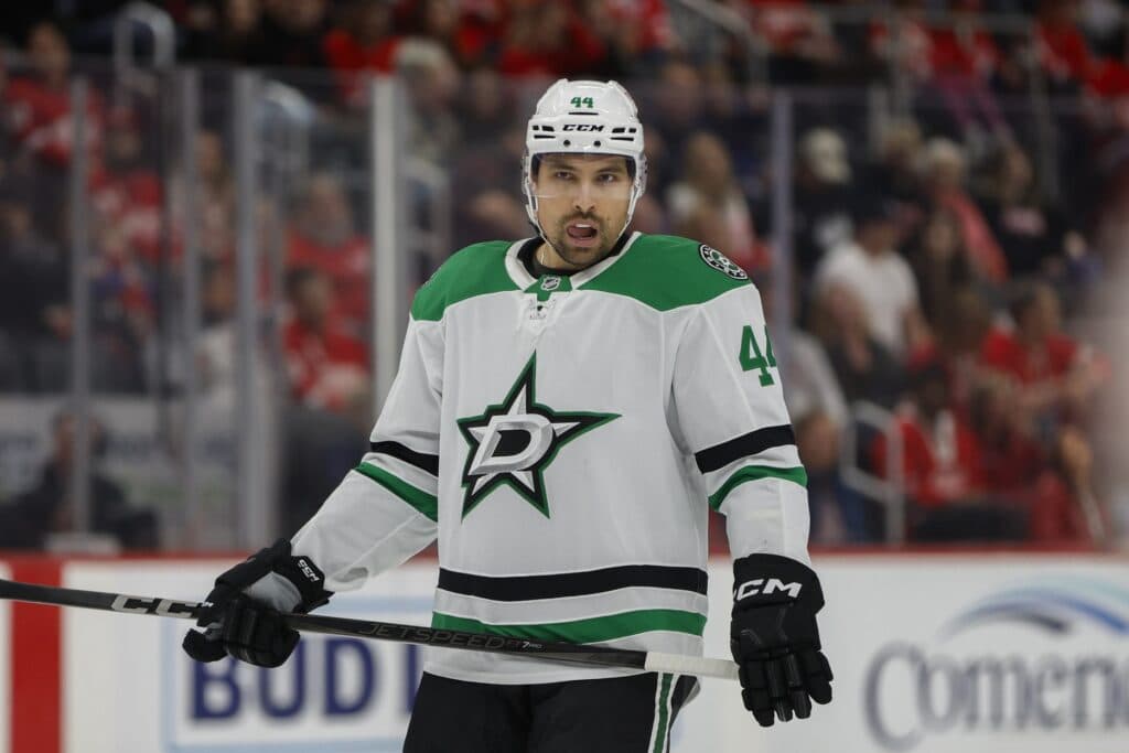 Apr 14, 2025; Detroit, Michigan, USA; Dallas Stars defenseman Cody Ceci (44) looks on during the first period against the Detroit Red Wings at Little Caesars Arena. Mandatory Credit: Brian Bradshaw Sevald-Imagn Images
