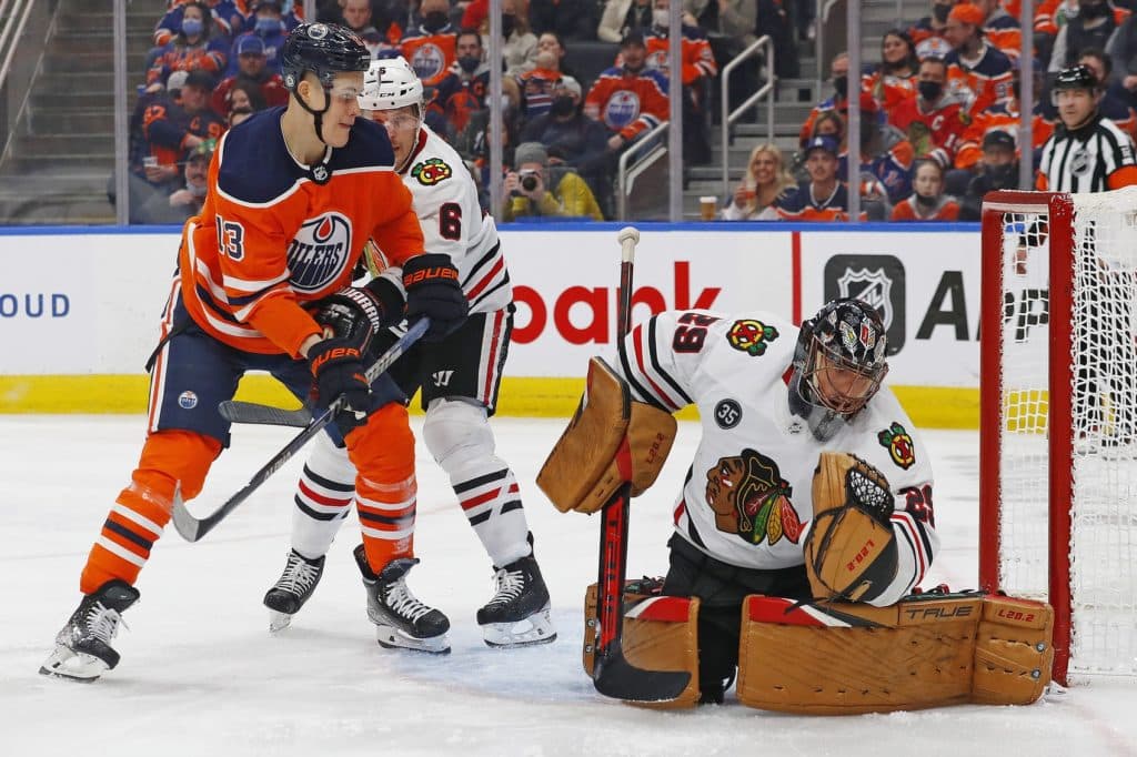 Feb 9, 2022; Edmonton, Alberta, CAN; Edmonton Oilers forward Jesse Puljujarvi (13) plays for the rebound in front of Chicago Blackhawks goaltender Marc-Andre Fleury (29) during the third period at Rogers Place. Mandatory Credit: Perry Nelson-USA TODAY Sports