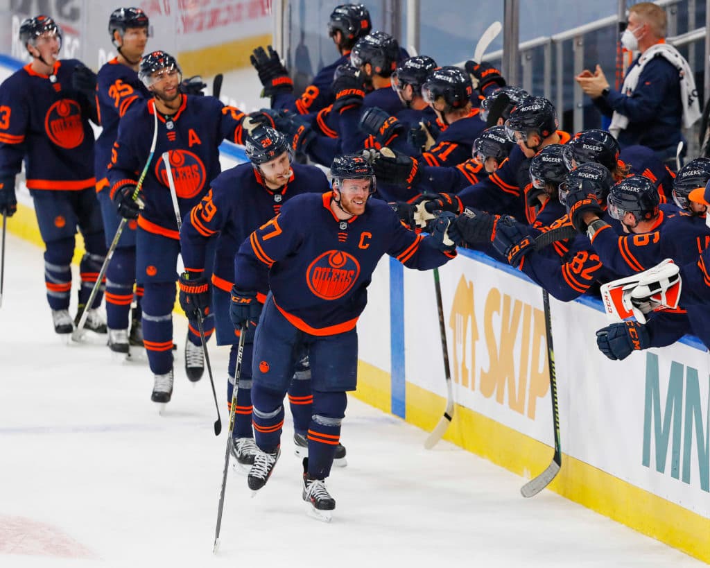 May 8, 2021; Edmonton, Alberta, CAN; Edmonton Oilers forward Connor McDavid (97) celebrates his 100th point of the season on a goal by forward Leon Draisaitl (29) against the Vancouver Canucks at Rogers Place. Mandatory Credit: Perry Nelson-USA TODAY Sports