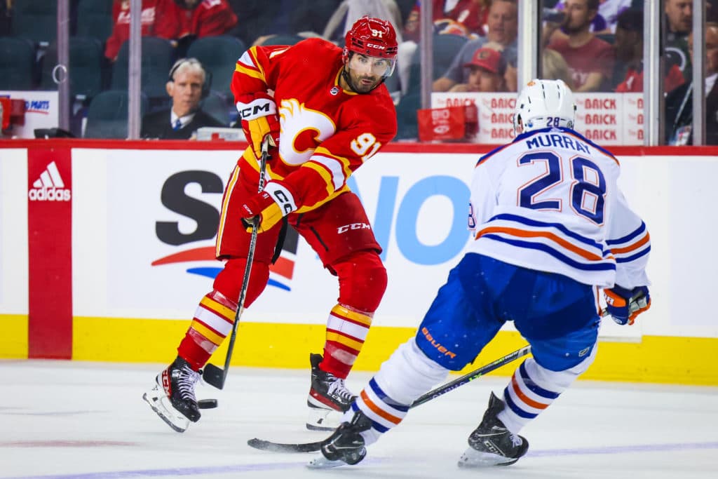 Sep 28, 2022; Calgary, Alberta, CAN; Calgary Flames center Nazem Kadri (91) passes the puck against the Edmonton Oilers during the third period at Scotiabank Saddledome. Mandatory Credit: Sergei Belski-USA TODAY Sports
