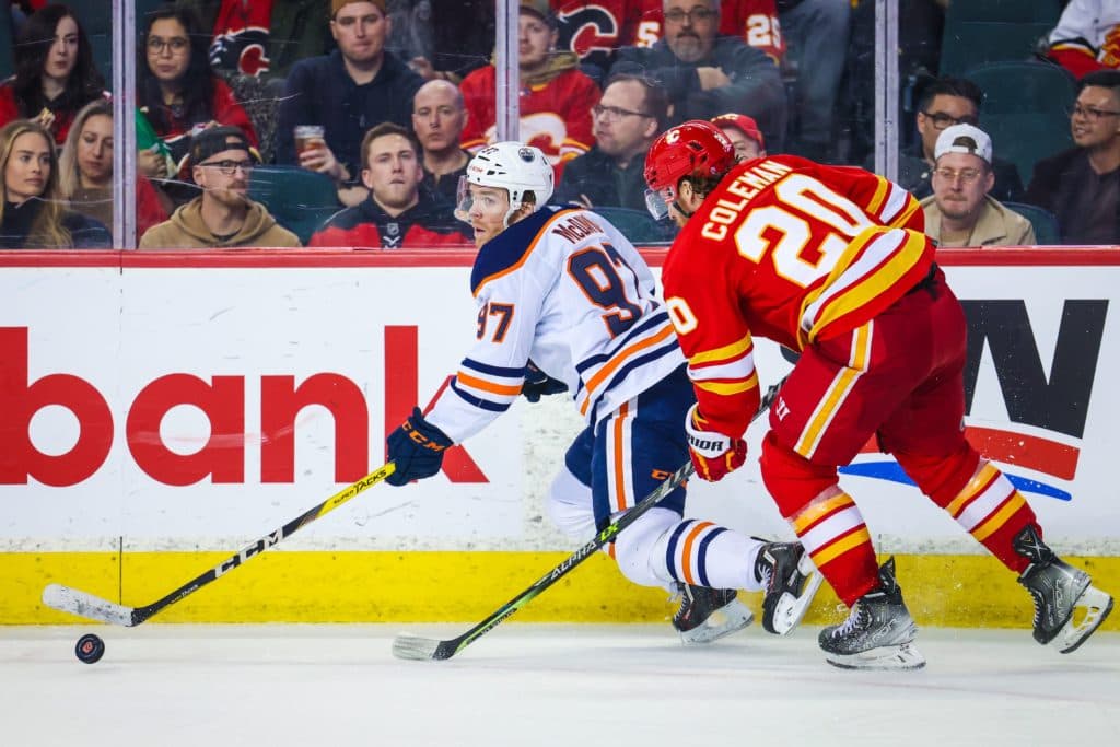 Mar 7, 2022; Calgary, Alberta, CAN; Edmonton Oilers center Connor McDavid (97) and Calgary Flames center Blake Coleman (20) battle for the puck during the third period at Scotiabank Saddledome. Mandatory Credit: Sergei Belski-USA TODAY Sports