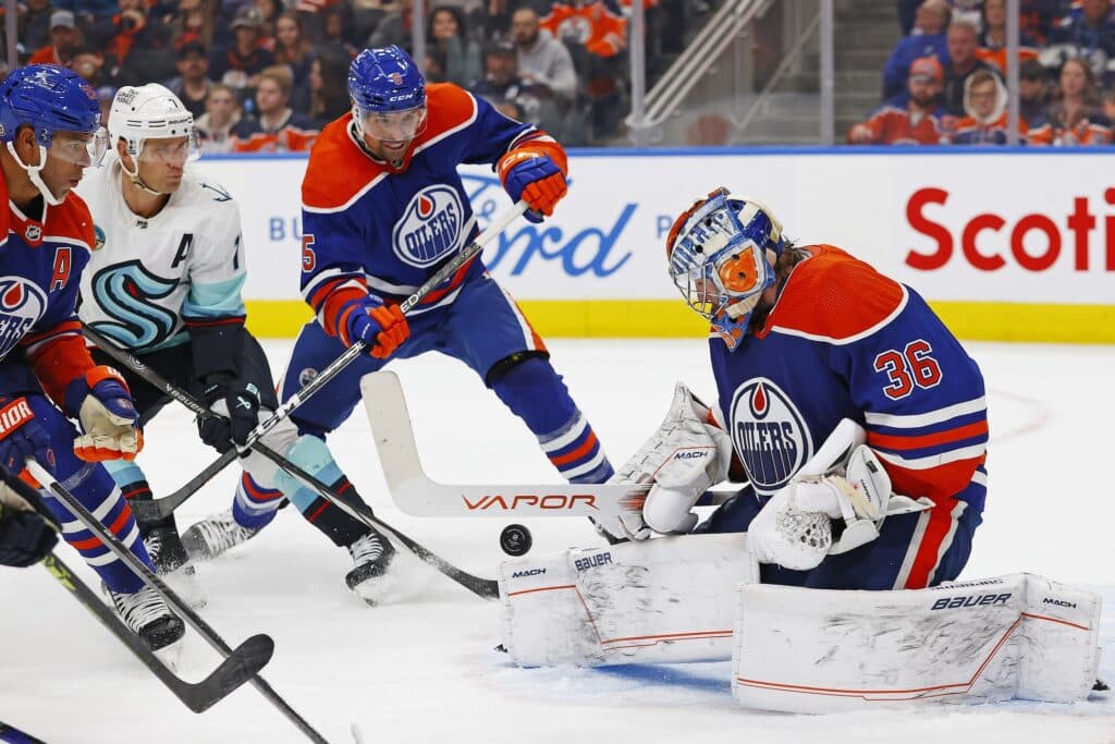 Oct 6, 2023; Edmonton, Alberta, CAN; Edmonton defensemen Cody Ceci (5) and Seattle Kraken forward Jaden Schwartz (17) look for a rebound in front of goaltender Jack Campbell (36) during the second period at Rogers Place. Mandatory Credit: Perry Nelson-USA TODAY Sports