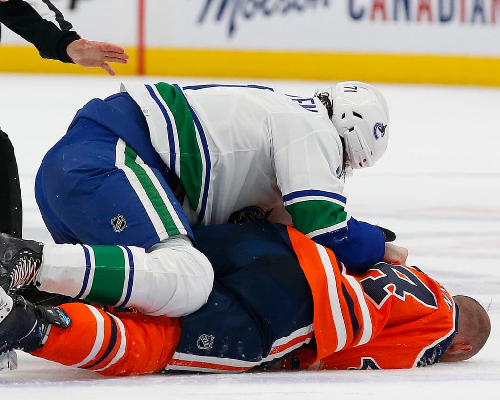 Years ago, the NHL brought in a rule that players could not take their helmets off before a fight – a macho ritual that was commonplace. Players found a way around that and you ended up with situations like this. Former Oiler Georges Laraque often tried to remove the helmets of opponents before fights to save his hands. That didn’t always end well. During a fight with Chris Simon, Simon’s helmet came off and he was injured when Laraque knocked him down and fell on him. There was no intent, but it can be dangerous.