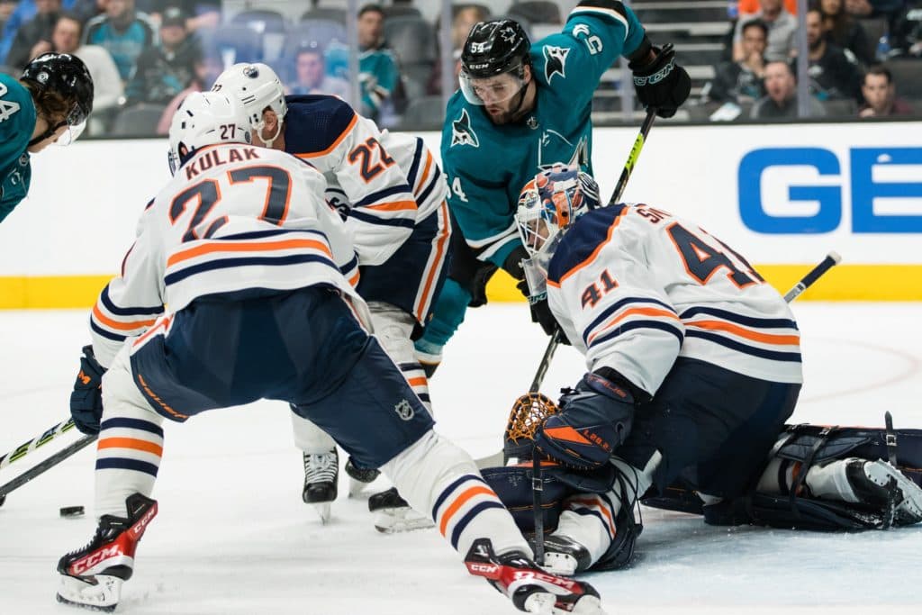 Apr 5, 2022; San Jose, California, USA; Edmonton Oilers goaltender Mike Smith (41) and defenseman Brett Kulak (27) defend against San Jose Sharks center Sasha Chmelevski (55) during the second period at SAP Center at San Jose. Mandatory Credit: John Hefti-USA TODAY Sports