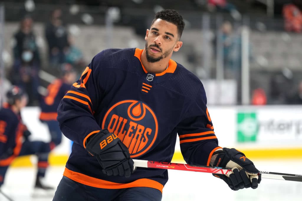 Feb 14, 2022; San Jose, California, USA; Edmonton Oilers left wing Evander Kane (91) warms up before the game against the San Jose Sharks at SAP Center at San Jose. Mandatory Credit: Darren Yamashita-USA TODAY Sports