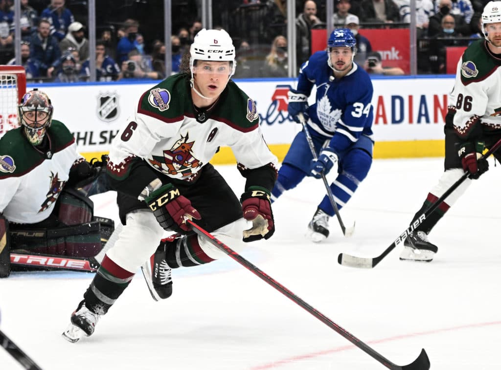 Mar 10, 2022; Toronto, Ontario, CAN; Arizona Coyotes defenseman Jakob Chychrun (6) pursues the play against the Toronto Maple Leafs in the third period at Scotiabank Arena. Mandatory Credit: Dan Hamilton-USA TODAY Sports