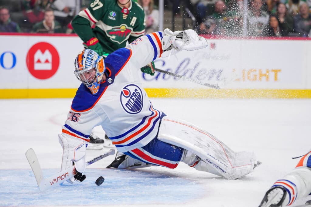 Oct 24, 2023; Saint Paul, Minnesota, USA; Edmonton Oilers goaltender Jack Campbell (36) makes a save against the Minnesota Wild in the second period at Xcel Energy Center.