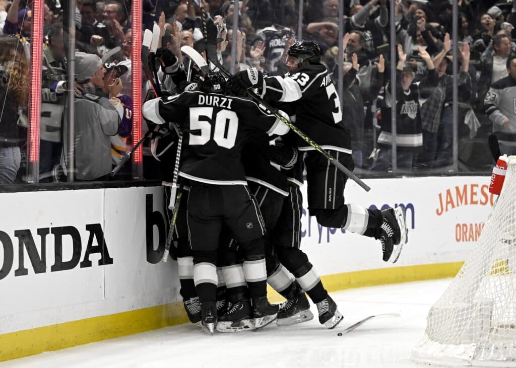 Apr 21, 2023; Los Angeles, California, USA; Los Angeles Kings left wing Trevor Moore (12) is congratulated by teammates after scoring the winning goal in the first overtime period of game three of the first round of the 2023 Stanley Cup Playoffs against the Edmonton Oilers at Crypto.com Arena. Mandatory Credit: Jayne Kamin-Oncea-USA TODAY Sports