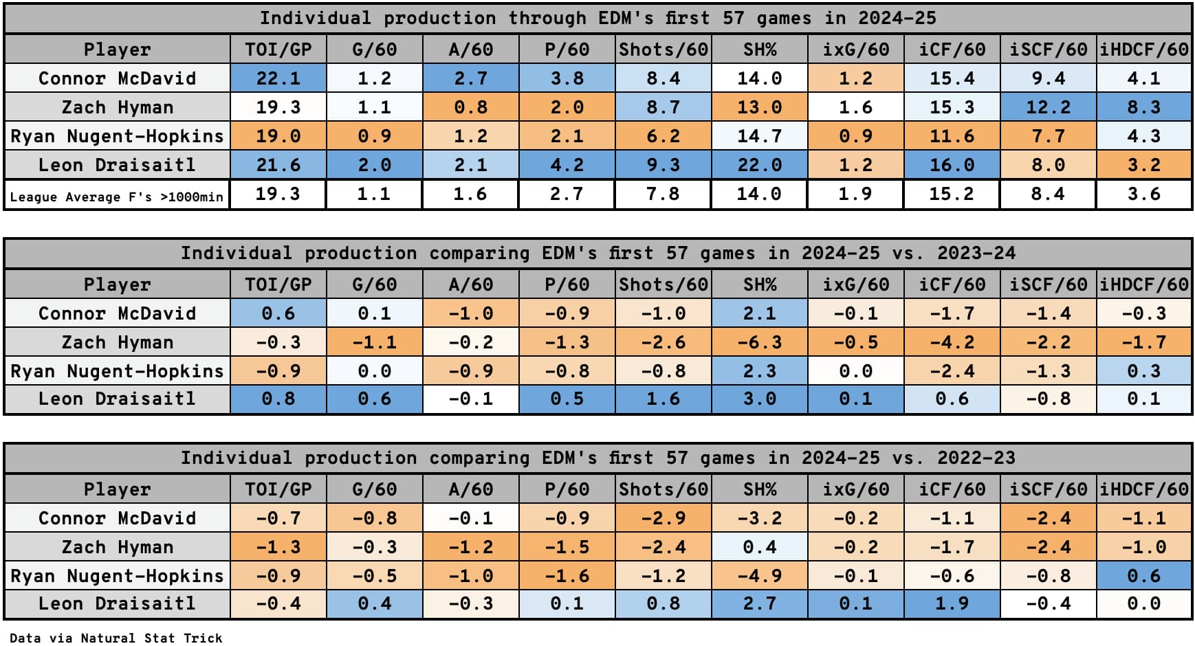 What could be part of the issue, however, is that those around him aren’t producing as they have in recent years. Zach Hyman, Ryan Nugent-Hopkins and Evan Bouchard have all seen notable drops in their offensive production through the Oilers’ first 57 games of this year compared to each of the last two.