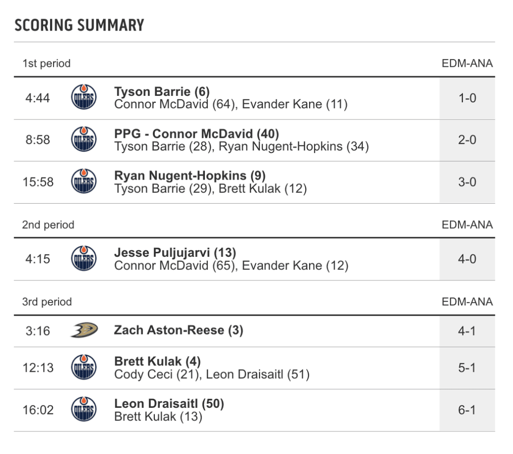 Tyson Barrie scored five minutes into the game to give the Oilers the early lead and they never looked back, as Connor McDavid and Ryan Nugent-Hopkins also scored in the first frame. Despite Edmonton’s history with Anaheim and 3-0 leads, the game went along smoothly after that. The Ducks got themselves on the board in the third period but Leon Draisaitl buried his 50th of the season to put the game to bed.