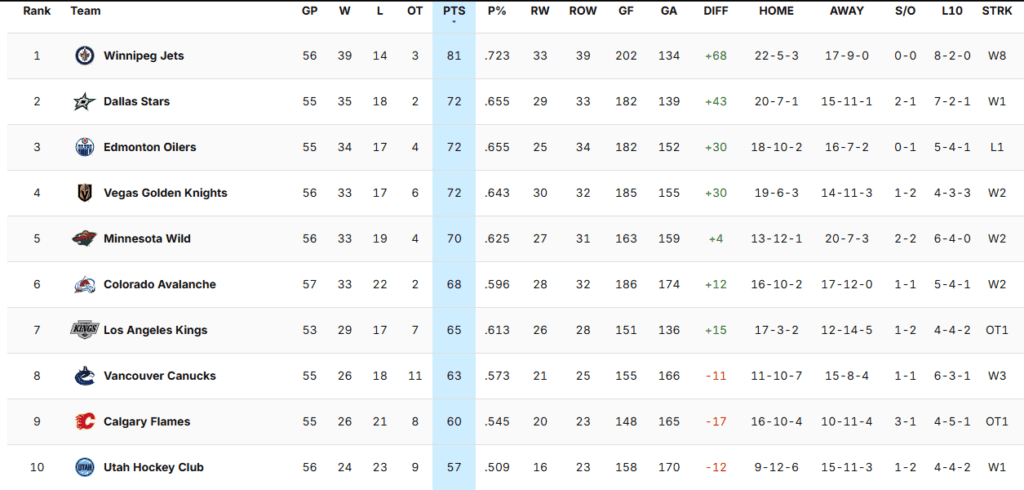 In the West, the race isn’t as intriguing as only Calgary is within five points of Vancouver for the final Wild Card position…