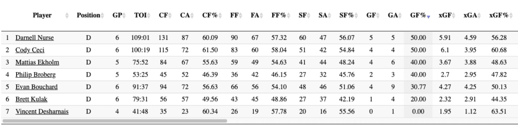 The Oilers badly need the Ekholm and Broberg pairing to be able to suppress goals against at even strength. Nurse and Ceci are the only Oilers defenders who have broken even in terms of on-ice goal differential and they have the benefit of playing the most minutes with the team’s best forwards. A top-four defensive pairing that can be above water when playing with the team’s secondary forwards would be huge.