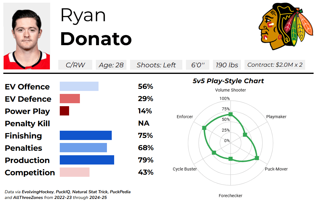 Ryan Donato is a 28-year-old forward on the Chicago Blackhawks, carrying a $2.0M cap-hit for two more seasons including this one. He ranks 16th on Chris Johnston’s Trade Board on The Athletic, and it was recently reported that the Oilers are one of several teams pursuing Donato.