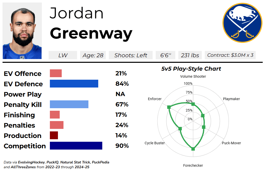 His underlying defensive metrics are fantastic, as despite the quality of opposition he faces, the Sabres consistently allow fewer goals and scoring chances per hour at 5-on-5 with Greenway on-ice. He effectively uses his size and physicality to his advantage by being an excellent forechecker. Greenway is also a fairly effective penalty-killer.