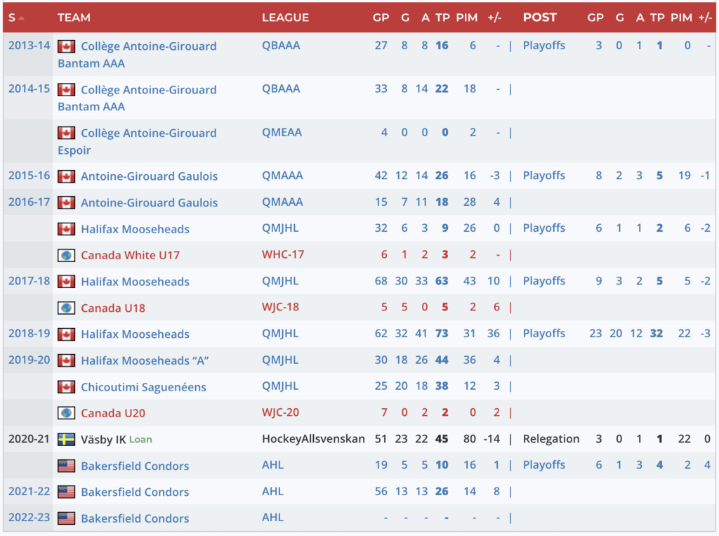 Given his September 25 birthday, Lavoie just missed being eligible for the 2018 NHL Draft, so his pre-draft season was his third go-around in the QMJHL. Lavoie scored 32 goals and 73 points in 62 games for the Mooseheads in 2018-19 but his breakout came in the playoffs when he scored 20 goals and 32 points over 23 games. Halifax lost in the finals to Rouyn-Noranda, who wound up also winning the Memorial Cup.