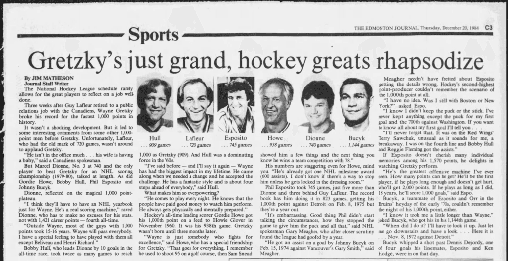 “I think they’ll have to have an NHL yearbook just for Wayne. He’s a real scoring machine,” said Marcel Dionne. “Outside Wayne, most of the guys with 1,000 points took 15-16 years. Wayne will pass everybody. I have a special feeling to have played with them all except Beliveau and Henri Richard.”“Wayne is just somebody who fights for excellence,” said Gordie Howe. “That goes for everything. I remember be used to shoot 95 on a golf course, then Sam Snead showed him a few things and the next thing you know, he wins a team competition with 78.”“He’s the greatest offensive machine I’ve ever seen,” said Phil Esposito. How many points can he get? He’ll be the first player, if he plays long enough and doesn’t get hurt, who’ll get 2,000 points. If he plays as long as I did, 18 years, he’ll score 1,000 goals.”