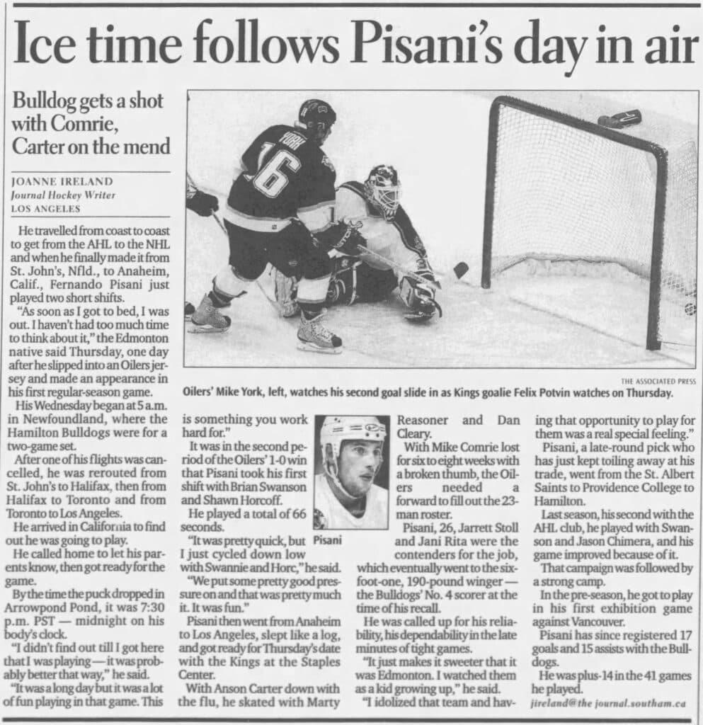 With forwards Anson Carter and Mike Comrie out with injuries, the Oilers were in need of some reinforcements from their minor-league affiliate. Among the players to get called up was Fernando Pisani, an Edmonton native who the Oilers had selected in the eighth round of the draft seven years earlier.