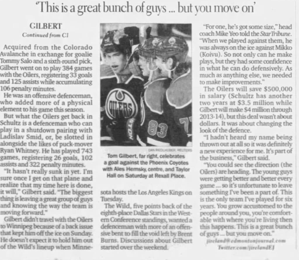 Edmonton Journal article regarding Oilers trading defenceman Tom Gilbert.