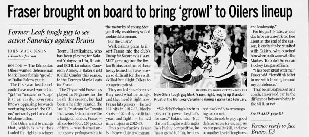 Mark Fraser adds “growl” to Oilers lineup.