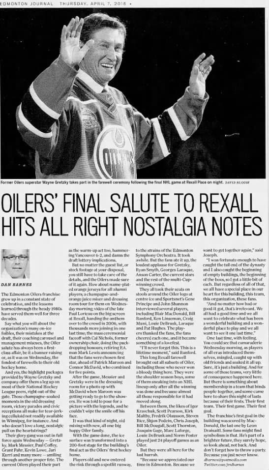 Here’s some of what the Edmonton Journal’s Dan Barnes wrote about the final night at the house that Gretzky built: